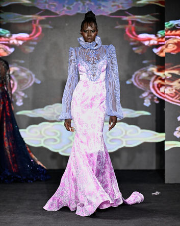 The *Eternal Dynasty* collection by Danny Nguyen Couture is a modern homage to Eastern culture, blending traditional elements with contemporary couture. The collection features a rich color palette of imperial gold, crimson red, deep jade, and midnight blue, symbolizing power, passion, purity, and mystery. Luxurious fabrics like silk, brocade, and velvet are adorned with intricate embroidery, evoking the textures and patterns of ancient Eastern art.